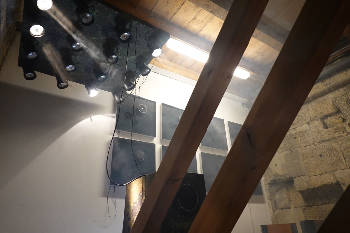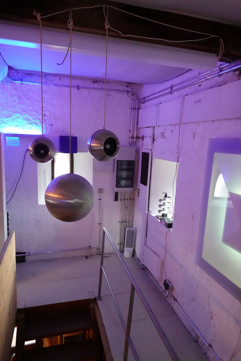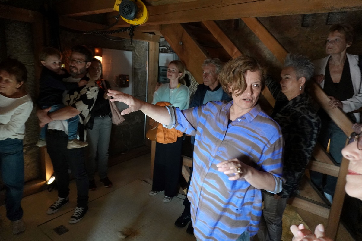 An seinem Fuß wartet eine Gruppe von fünfzehn Leuten auf Einlass. Mehr würden die engen Räume nicht verkraften. Kurz darauf biegt Petra Giers um die Ecke, die Frau des 2016 verstorbenen Künstlers, die gemeinsam mit Sohn Victor die Tour begleiten wird. Etliche Treppenstufen werden erklommen, ehe auch nur das unterste Geschoss erreicht ist, ein Zimmer mit nackten Steinwänden, in dem der Besuch aus Göppingen von Nebelschwaden begrüßt wird: Eines der Lebensthemen von Walter Giers war die Interpretation von Naturphänomenen durch technische Mittel – weshalb dann wenig später auch Blitze zucken und Donner rollt. Das Führungs-Duo erweist sich als Quelle zahlloser spannender und schräger Familiengeschichten, die dem Unternehmen Turmbesteigung von Etage zu Etage mehr eine ganz persönliche Note verleihen. Auch die Kunst gibt mit zunehmender Höhe immer weitere Geheimnisse preis, steigert sich, blinkt, rauscht, weckt Neugier, was da noch alles kommen wird – während die Kunstvereinsmitglieder zum Beispiel erfahren, dass Walter Giers im Lauf seines Lebens auch mehrere Patente beantragt hat, allerdings regelmäßig die falschen: Den Kugellautsprecher etwa hat er zwar erfunden, aber zum wirtschaftlichen Leidwesen seiner Erben nie die Rechte daran eingefordert. Heute hängen mehrere Exemplare im Turm, die in Stuttgart bereits Teil einer Klanginstallation im öffentlichen Raum waren: Aus Baumkronen heraus verblüfften sie Vorbeigehende mit unerwarteten Geräuschen.